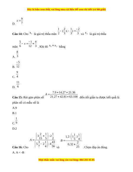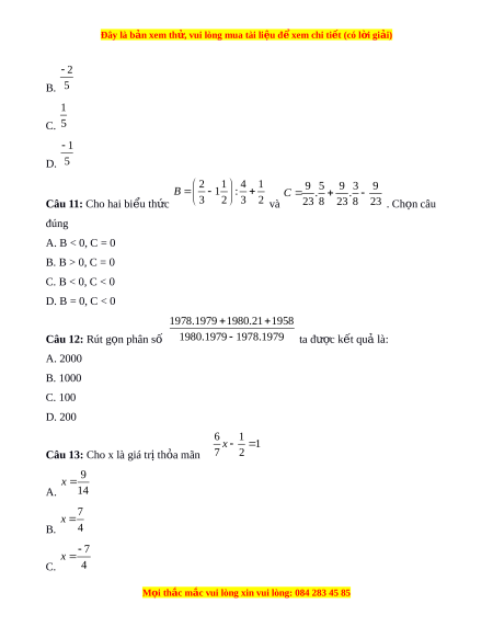 Đây là bản xem th , vu ử i lòng mua tài li u ệ đ xe ể m chi ti t (c ế ó l i ờ gi i ả ) 2 B. 5 1 C. 5 1 D. 5 2 1 4 1 B 9 5 9 3 9 1 : C . . Câu 11: Cho hai bi u t ể h c ứ 3 2 3 2 và 23 8 23 8 23 . Ch n câu ọ đúng A. B < 0, C = 0 B. B > 0, C = 0 C. B < 0, C < 0 D. B = 0, C < 0 1978.1979 1980.211958 Câu 12: Rút g n phân ọ số