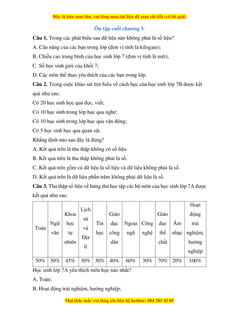 Câu 3. Thu thập số liệu về hứng thú học tập các bộ môn của học sinh lớp 7A được