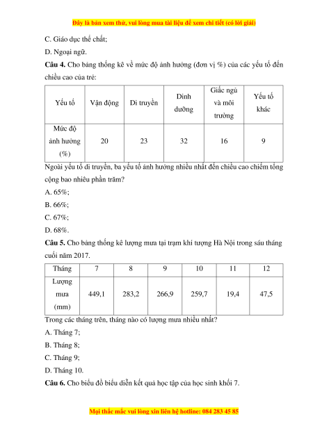 Câu 4. Cho bảng thống kê về mức độ ảnh hưởng (đơn vị %) của các yếu tố đến chiều cao của trẻ: Giấc ngủ Dinh Yếu tố Yếu tố Vận động Di truyền và môi dưỡng khác trường Mức độ ảnh hưởng 20 23 32 16 9 (%)