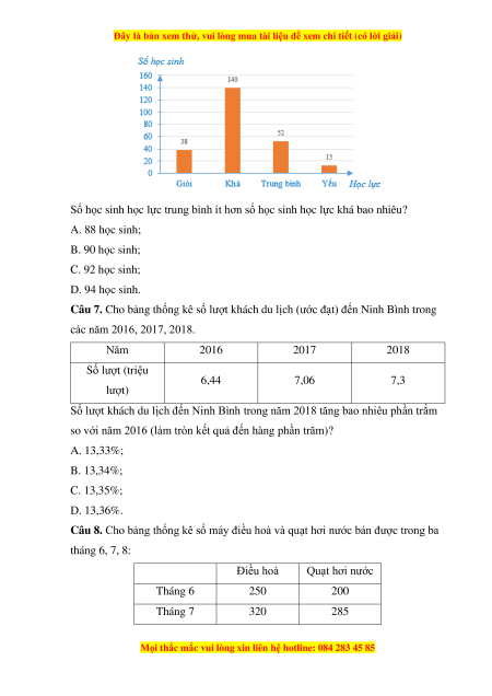 Câu 7. Cho bảng thống kê số lượt khách du lịch (ước đạt) đến Ninh Bình trong các năm 2016, 2017, 2018. Năm 2016 2017 2018 Số lượt (triệu 6,44 7,06 7,3 lượt)