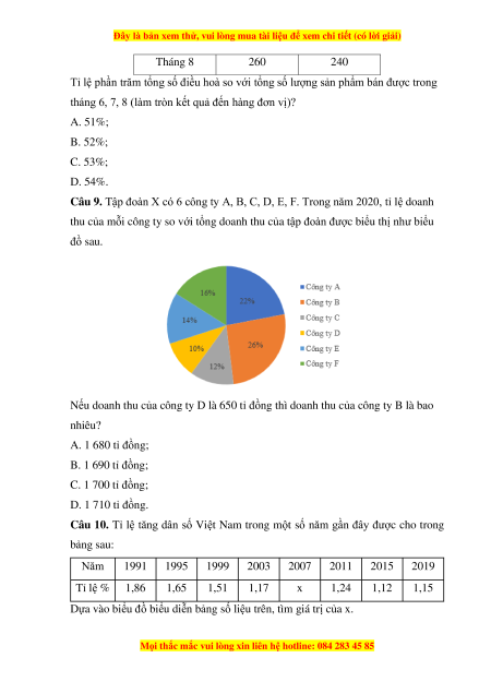 tháng 6, 7, 8 (làm tròn kết quả đến hàng đơn vị)? A. 51%; B. 52%; C. 53%; D. 54%.