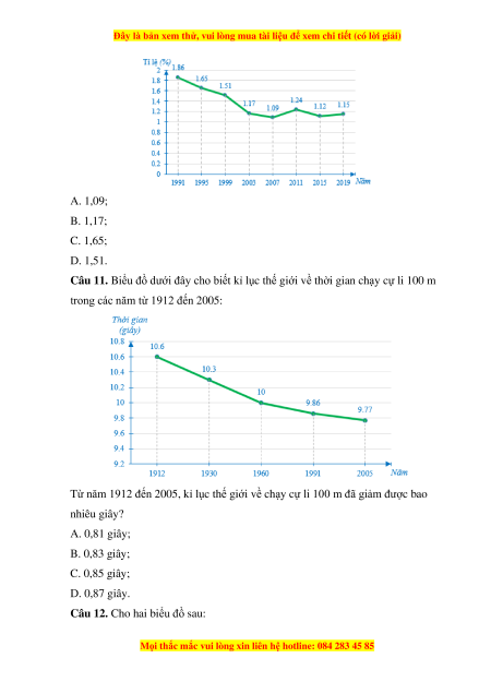 Câu 10. Tỉ lệ tăng dân số Việt Nam trong một số năm gần đây được cho trong bảng sau: Năm 1991 1995 1999 2003 2007 2011 2015 2019 Tỉ lệ % 1,86 1,65 1,51 1,17 x 1,24 1,12 1,15