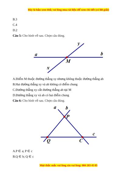 Câu 6: Cho hình vẽ sau. Ch n câu ọ đúng. A.P ∈ a; P ∈ c B.Q ∈ b; Q ∈ c M i ọ thắc m c