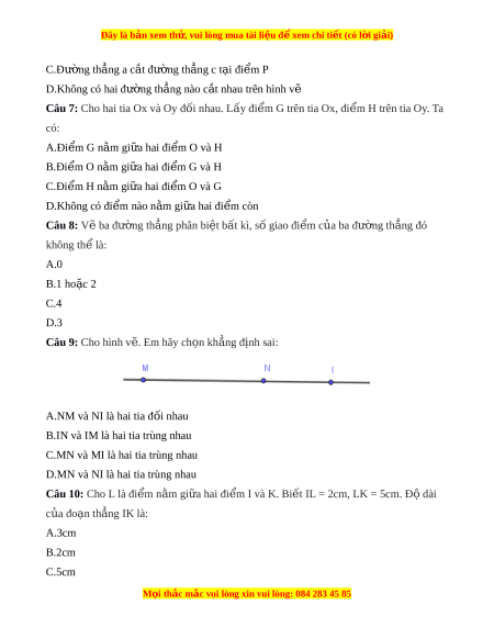 Câu 10: Cho L là đi m n m gi a hai đi m I và K. Bi tể ằ ữ ể ế IL = 2cm, LK = 5cm. Đ dài ộ
