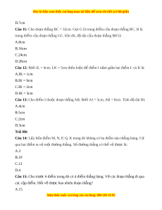 ế IL = 4cm; LK = 5cm đi u ki ề ện đ đi ể m ể I n m ằ gi a hai ữ đi m ể L và K là: A.IK = 1cm B.IK = 9cm C.IK = 2cm D.IK = 3cm Câu 13: Cho đi m ể I thu c đo ộ n ạ th ng ẳ AB. Bi t