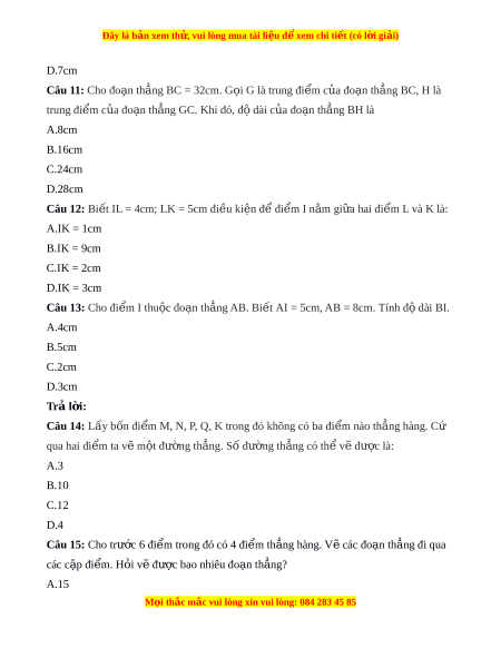 Đây là bản xem th , vu ử i lòng mua tài li u ệ đ xe ể m chi ti t (c ế ó l i ờ gi i ả ) D.7cm Câu 11: Cho đo n t ạ h ng ẳ BC = 32cm. G i ọ G là trung đi m ể c a đo ủ n ạ th ng ẳ BC, H là trung đi m ể c a đo ủ n ạ th ng ẳ GC. Khi đó, đ dài ộ c a ủ đo n t ạ h ng ẳ BH là A.8cm B.16cm C.24cm D.28cm Câu 12: Bi t