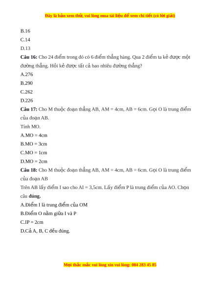 Câu 15: Cho trư c 6 đi ớ m ể trong đó có 4 đi m ể th ng hàng. ẳ V các đo ẽ n ạ th ng đi ẳ qua các c p đi ặ m ể . H i ỏ v đ ẽ ư c bao nhi ợ êu đo n ạ th ng? ẳ A.15 M i ọ thắc m c