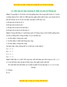 ả bóng xanh và 9 bóng vàng có kích thư c gi ớ ng nhau. ố An lấy ra đồng th i ờ 2 bóng t h ừ p. C ộ ó các s ki ự n s ệ au: 1- An lấy đư c 2 bóng m ợ àu xanh 2- An lấy đư c í ợ t nh t ấ m t ộ bóng màu vàng 3- An lấy đư c 2 bóng m ợ àu vàng. S ki ự ện ch c ắ ch n, ắ không thể và có th x ể y ả ra l n l ầ ư t ợ là A.1 – 2 – 3 B.2 – 3 – 1 C.3 – 2 – 1 D.2 – 1 – 3 Câu 3: M t ộ h p có 5 chi ộ c ế th cùng ẻ lo i ạ , m i ỗ th đ ẻ ư c ợ ghi m t ộ trong các s 1, 2, 3, ố 4, 5; hai th khác nhau ẻ thì ghi s khác ố nhau. Rút ng u nhi ẫ ên m t ộ th . ẻ Số xuất hi n t ệ rên th đ ẻ ư c ợ rút có ph i ả là ph n t ầ c ử a t ủ p ậ h p {1; ợ 2; 3; 4; 5} hay không? A. Không B. Có M i ọ thắc m c