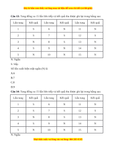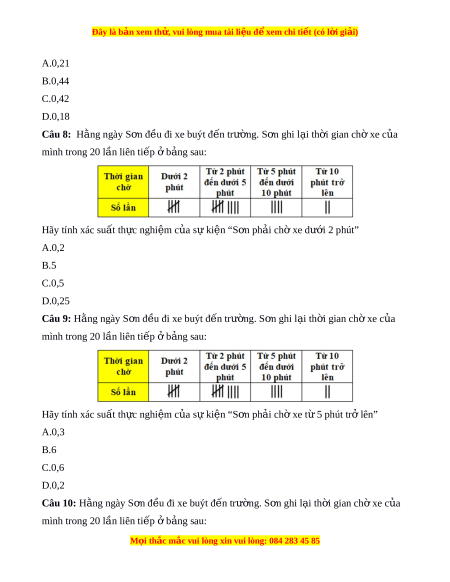Đây là bản xem th , vu ử i lòng mua tài li u ệ đ xe ể m chi ti t (c ế ó l i ờ gi i ả ) A.0,21 B.0,44 C.0,42 D.0,18 Câu 8: H ng ngày ằ S n đ ơ u đi ề xe buýt đ n t ế rư ng. ờ S n ghi ơ l i ạ th i ờ gian ch xe c ờ a ủ mình trong 20 l n l ầ iên ti p ế ở b ng s ả au: Hãy tính xác su t ấ th c nghi ự m ệ c a s ủ ự ki n “ ệ S n ph ơ i ả chờ xe dư i ớ 2 phút” A.0,2 B.5 C.0,5 D.0,25 Câu 9: H ng ngày ằ S n đ ơ u đi ề xe buýt đ n t ế rư ng. ờ S n ghi ơ l i ạ th i ờ gian ch xe c ờ a ủ mình trong 20 l n l ầ iên ti p ế ở b ng s ả au: Hãy tính xác su t ấ th c nghi ự m ệ c a s ủ ự ki n “ ệ S n ph ơ i ả chờ xe t 5 phút ừ trở lên” A.0,3 B.6 C.0,6 D.0,2 Câu 10: H ng ngày ằ S n đ ơ u đi ề xe buýt đ n t ế rư ng. ờ S n ghi ơ l i ạ th i ờ gian ch xe c ờ a ủ mình trong 20 l n l ầ iên ti p ế ở b ng s ả au: M i ọ thắc m c