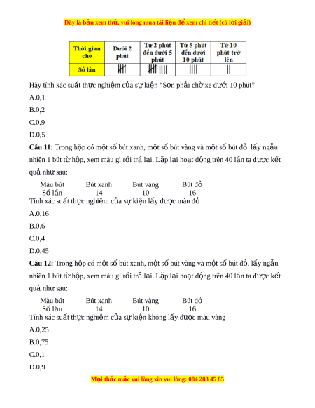 Đây là bản xem th , vu ử i lòng mua tài li u ệ đ xe ể m chi ti t (c ế ó l i ờ gi i ả ) Hãy tính xác su t ấ th c nghi ự m ệ c a s ủ ự ki n “ ệ S n ph ơ i ả chờ xe dư i ớ 10 phút” A.0,1 B.0,2 C.0,9 D.0,5 Câu 11: Trong h p ộ có m t ộ số bút xanh, m t ộ số bút vàng và m t ộ số bút đ . l ỏ y ng ấ u ẫ nhiên 1 bút t h ừ p, ộ xem màu gì r i ồ tr l ả i ạ . L p l ặ i ạ ho t ạ đ ng t ộ rên 40 l n t ầ a đư c k ợ t ế quả nh s ư au: Màu bút Bút xanh Bút vàng Bút đỏ Số lần 14 10 16 Tính xác su t ấ th c nghi ự m ệ c a ủ s ki ự n l ệ y đ ấ ư c ợ màu đỏ A.0,16 B.0,6 C.0,4 D.0,45