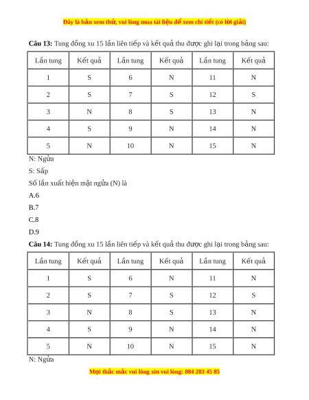 Câu 14: Tung đ ng xu 15 l n liên ti p và k t qu thu đ c ghi l i trong b ng sau:ồ ầ ế ế ả ượ ạ ả