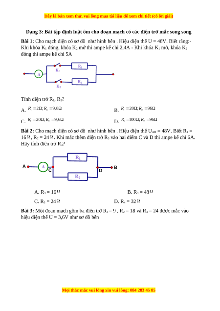 Bài 3: Một đoạn mạch gồm ba điện trở R1 = 9 , R2 = 18 và R3 = 24 được mắc vào