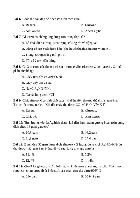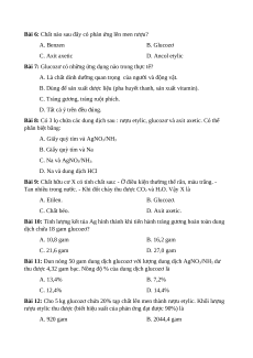 Bài 6: Chất nào sau đây có phản ứng lên men rượu? A. Benzen B. Glucozơ C. Axit axetic D. Ancol etylic