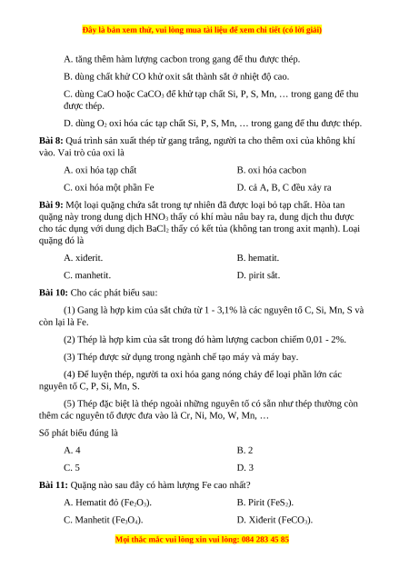 Bài 8: Quá trình sản xuất thép từ gang trắng, người ta cho thêm oxi của không khí vào. Vai trò của oxi là A. oxi hóa tạp chất B. oxi hóa cacbon C. oxi hóa một phần Fe