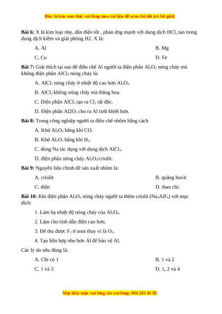 Bài 9: Nguyên liệu chính để sản xuất nhôm là: A. criolit B. quặng boxit C. điện D. than chì.