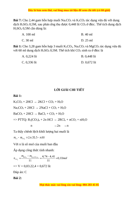 K2CO3 + H2SO4 → K2SO4 + CO2 + H2O y mol y mol y mol y mol = x + y = 0,02 mol (2) Từ 2 PT ta có: lít = 40 ml Đáp án: B Bài 1: = 0,5.0,06 = 0,03 mol