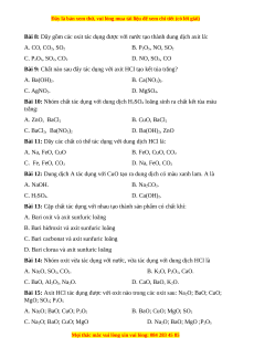Bài 14: Nhóm oxit vừa tác dụng với nước, vừa tác dụng với dung dịch HCl là A. Na2O, SO3, CO2. B. K2O, P2O5, CaO. C. BaO, Al2O3, Na2O. D. CaO, BaO, K2O.