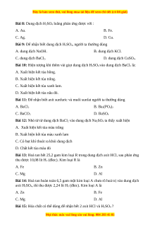 Bài 7: Dãy kim loại phản ứng được với dung dịch H2SO4 loãng là A. Cu, Zn, Na. B. Au, Pt, Cu. C. Ag, Ba, Fe. D. Mg, Fe, Zn.