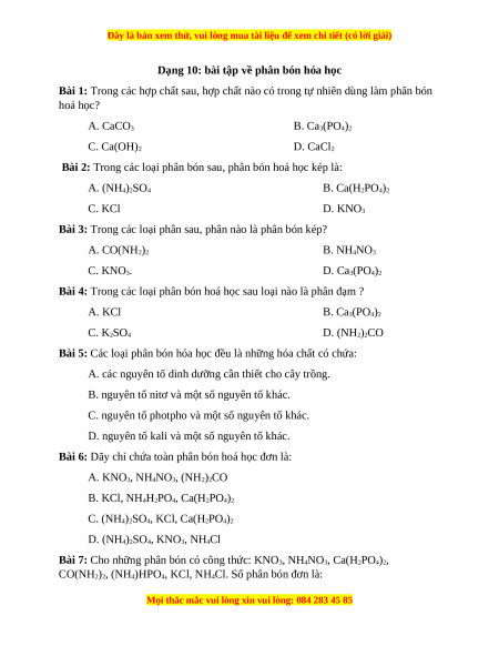 Bài 6: Dãy chỉ chứa toàn phân bón hoá học đơn là: A. KNO3, NH4NO3, (NH2)2CO B. KCl, NH4H2PO4, Ca(H2PO4)2 C. (NH4)2SO4, KCl, Ca(H2PO4)2 D. (NH4)2SO4, KNO3, NH4Cl