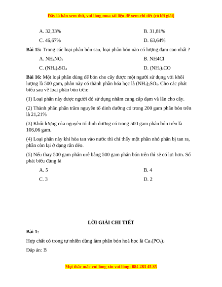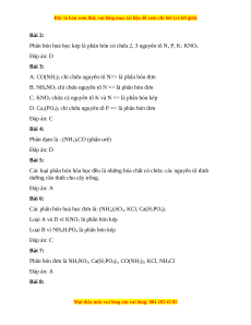 (5) Nếu thay 500 gam phân urê bằng 500 gam phân bón trên thì sẽ có lợi hơn. Số phát biểu đúng là A. 5 B. 4 C. 3 D. 2 LỜI GIẢI CHI TIẾT Bài 1: