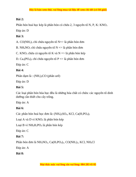 Phân bón đơn là NH4NO3, Ca(H2PO4)2, CO(NH2)2, KCl, NH4Cl Đáp án: A Bài 8: