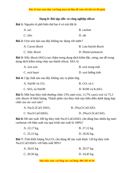 Dạng 8: Bài tập silic và công nghiệp silicat
