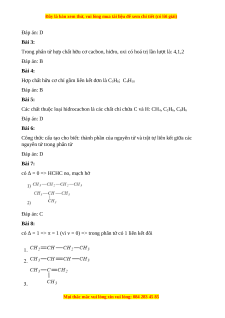 Bài 4: Hợp chất hữu cơ nào sau đây chỉ gồm liên kết đơn? A. C3H8; C2H2. B. C3H8; C4H10 C. C4H10; C2H2 D. C4H10; C6H6(benzen)
