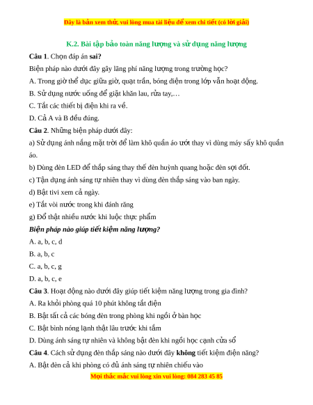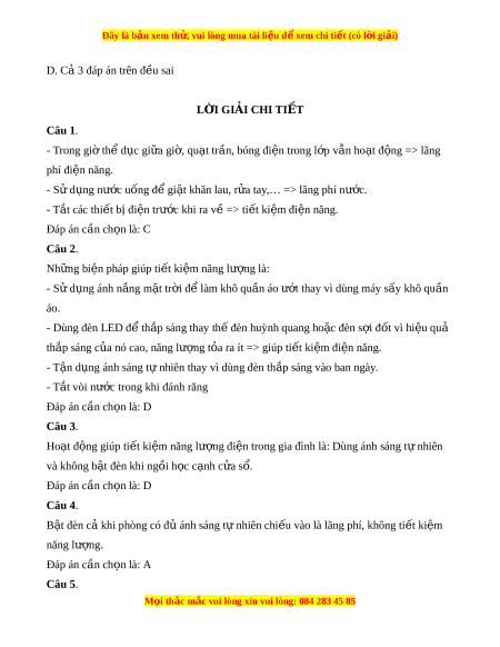 Đây là bản xem th , vu ử i lòng mua tài li u ệ đ xe ể m chi ti t (c ế ó l i ờ gi i ả ) D. C 3 đáp án ả trên đ u s ề ai L I Ờ GIẢI CHI TI T Ế Câu 1. - Trong giờ th d ể c gi ụ a gi ữ , ờ qu t ạ tr n, bóng đi ầ n t ệ rong l p ớ v n ho ẫ t ạ đ ng => l ộ ãng phí đi n năng. ệ - S d ử ng n ụ ư c ớ uống đ gi ể t ặ khăn lau, r a t