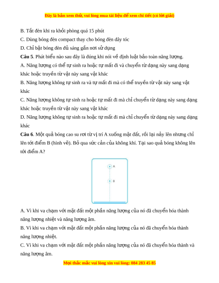 au đây là đúng khi nói v đ ề nh l ị u t ậ b o ả toàn năng lư ng. ợ A. Năng lư ng có t ợ h t ể s ự inh ra ho c t ặ m ự t ấ đi và chuy n t ể d ừ ng ạ này sang d ng ạ khác ho c t ặ ruy n t ề v ừ t ậ này sang v t ậ khác B. Năng lư ng không t ợ s ự inh ra và t m ự t ấ đi mà có th t ể ruy n t ề v ừ t ậ này sang v t ậ khác C. Năng lư ng không t ợ s ự inh ra ho c t ặ m ự t ấ đi mà ch chuy ỉ n t ể d ừ ng ạ này sang d ng ạ khác ho c t ặ ruy n t ề v ừ t ậ này sang v t ậ khác D. Năng lư ng không t ợ s ự inh ra ho c ặ t m ự t ấ đi mà ch chuy ỉ n ể t d ừ ng này s ạ ang d ng ạ khác Câu 6. M t ộ qu bóng cao ả su r i ơ t v ừ t ị rí A xu ng m ố t ặ đ t ấ , r i ồ l i ạ n y ả lên nh ng ch ư ỉ lên t i ớ đi m ể B (hình v ) ẽ . B qua ỏ s c c ứ n c ả a ủ không khí. T i ạ sao qu bóng không l ả ên t i ớ đi m ể A? A. Vì khi va ch m ạ v i ớ m t ặ đ t ấ m t ộ ph n năng ầ lư ng c ợ a nó đã ủ chuy n hóa t ể hành năng lư ng ợ nhi t ệ và năng lư ng âm ợ . B. Vì khi va ch m ạ v i ớ m t ặ đ t ấ m t ộ ph n năng l ầ ư ng c ợ a ủ nó đã chuy n hóa ể thành năng lư ng ợ nhi t ệ . C. Vì khi va ch m ạ v i ớ m t ặ đ t ấ m t ộ ph n năng l ầ ư ng c ợ a ủ nó đã chuy n hóa ể thành và năng lư ng ợ âm. M i ọ thắc m c