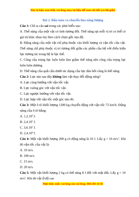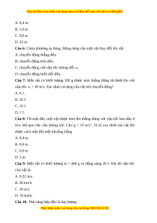 Đây là bản xem th , vu ử i lòng mua tài li u ệ đ xe ể m chi ti t (c ế ó l i ờ gi i ả ) A. 0,4 m. B. 1,0 m. C. 9,8 m. D. 32 m. Câu 6: Ch n ph ọ ư ng ơ án đúng. Đ ng năng ộ c a m ủ t ộ v t ậ thay đ i ổ khi v t ậ A. chuy n ể đ ng t ộ h ng đ ă u. ề B. chuy n đ ể ng t ộ ron đ u. ề C. chuy n đ ể ng v ộ i ớ v n t ậ ốc không đổi v0. D. chuy n ể đ ng bi ộ n đ ế ổi đ u. ề Câu 7: M t ộ v t ậ có kh i ố lư ng ợ 100 g đư c ợ ném th ng ă đ ng ứ từ dư i ớ lên v i ớ v n