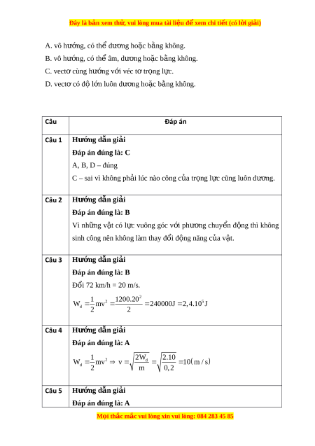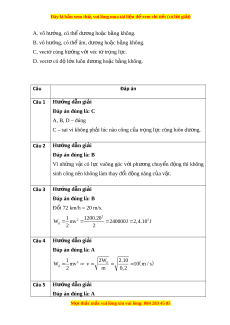 Đây là bản xem th , vu ử i lòng mua tài li u ệ đ xe ể m chi ti t ế (có l i ờ gi i ả ) A. vô hư ng, có t ớ hể dư ng ho ơ c ặ b ng không. ằ B. vô hư ng, ớ có th âm ể , dư ng ho ơ c b ặ ng ằ không. C. vectơ cùng hư ng v ớ i ớ véc t t ơ r ng l ọ c. ự D. vect có đ ơ ộ l n l ớ uôn dư ng ho ơ c ặ b ng không. ằ Câu Đáp án Câu 1 Hư ng ớ d n gi ẫ i ả Đáp án đúng là: C A, B, D – đúng C – sai vì không ph i ả lúc nào công c a t ủ r ng l ọ c cũng l ự uôn dư ng. ơ Câu 2 Hư ng ớ d n gi ẫ i ả Đáp án đúng là: B Vì nh ng ữ v t ậ có l c ự vuông góc v i ớ phư ng ơ chuy n ể đ ng ộ thì không