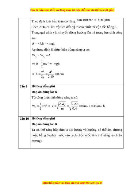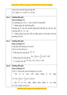 Đây là bản xem th , vu ử i lòng mua tài li u ệ đ xe ể m chi ti t (c ế ó l i ờ gi i ả ) Ch n ọ mốc tính thế năng m ở t ặ đ t ấ . W m gh 8 2 .10.h h 0 , 4 m t Câu 6 Hư ng d ớ ẫn gi i ả Đáp án đúng là: D Các phư ng án ơ A, B, C – v t ậ có v n ậ t c ố không đ i ổ . Đ ng ộ năng c a v ủ t ậ không đổi Phư ng ơ án D - khi v t ậ chuy n ể đ ng ộ bi n ế đ i ổ đ u ề thì v n ậ t c ố c a ủ v t ậ thay đổi (v = v0 + at) Đ ng ộ năng cũng thay đ i ổ do đ ng ộ năng tỉ lệ thu n ậ v i ớ bình phư ng ơ v n t ậ ốc. Câu 7 Hư ng d ớ ẫn gi i ả Đáp án đúng là: B Ch n ọ gốc th năng t ế i ạ v t ị rí ném T i ạ vị trí ném v t ậ ta có: + Th năng ế c a v ủ t ậ t i ạ đó: W 0 t 1 2 1 2 W mv .0,1.20 20 J + Đ ng ộ năng c a v ủ t ậ t i ạ đó: d 0 2 2 Cơ năng c a ủ v t ậ : W W W 20 0 2 0J d t Câu 8 Hư ng d ớ ẫn gi i ả Đáp án đúng là: B Cách 1: Ch n ọ m c t ố ính th năng t ế i ạ v t ị rí ném - T i