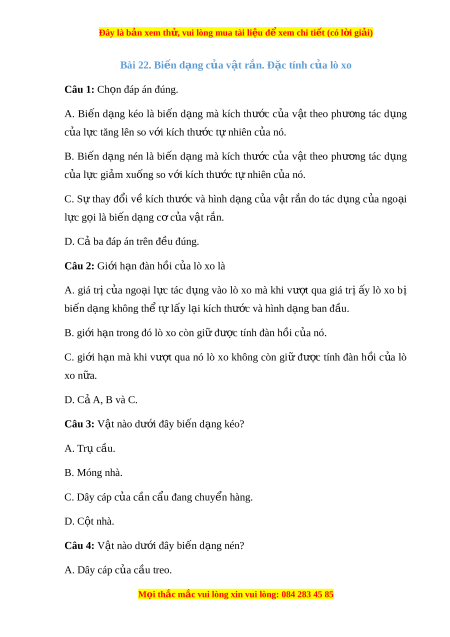 Đây là bản xem th , vu ử i lòng mua tài li u ệ đ xe ể m chi ti t ế (có l i ờ gi i ả ) Bài 22. Bi n d ế ng c ạ a v ủ t ậ r n. Đ ắ c t ặ ính c a l ủ ò xo Câu 1: Ch n ọ đáp án đúng. A. Bi n ế d ng ạ kéo là bi n ế d ng ạ mà kích thư c ớ c a ủ v t ậ theo phư ng ơ tác d ng ụ c a l ủ c ự tăng lên so v i ớ kích thư c ớ t nhi ự ên c a ủ nó. B. Bi n ế d ng ạ nén là bi n ế d ng ạ mà kích thư c ớ c a ủ v t ậ theo phư ng ơ tác d ng ụ c a l ủ c ự gi m ả xuống so v i ớ kích thư c ớ t nhi ự ên c a nó. ủ C. Sự thay đ i ổ v ề kích thư c ớ và hình d ng ạ c a ủ v t ậ r n ắ do tác d ng ụ c a ủ ngo i ạ l c g ự i ọ là bi n d ế ng ạ c c ơ a ủ v t ậ r n. ắ