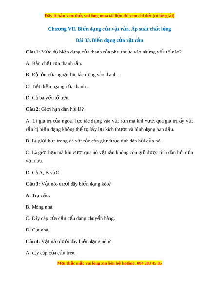 Đây là bản xem th , vu ử i lòng mua tài li u ệ đ xe ể m chi ti t (c ế ó l i ờ gi i ả ) Chư ng ơ VII. Bi n ế d ng c ạ a v ủ t ậ r n. Á ắ p su t ấ ch t ấ l ng ỏ Bài 33. Bi n d ế ng c ạ a v ủ t ậ r n ắ Câu 1: M c ứ đ bi ộ n d ế ng c ạ a ủ thanh r n ph ắ t ụ hu c ộ vào nh ng y ữ u t ế nào? ố A. B n ch ả ất c a ủ thanh r n. ắ B. Đ l ộ n c ớ a ủ ngo i ạ l c t ự ác d ng vào t ụ hanh. C. Ti t ế di n ngang c ệ a t ủ hanh. D. C ba y ả u ế tố trên. Câu 2: Gi i ớ h n đàn ạ hồi là? A. Là giá trị c a ủ ngo i ạ l c ự tác d ng ụ vào v t ậ r n ắ mà khi vư t ợ qua giá tr ị y ấ v t ậ r n b ắ ị bi n d ế ng ạ không th t ể l ự y l ấ i ạ kích thư c và ớ hình d ng ban đ ạ u. ầ B. Là gi i ớ h n ạ trong đó v t ậ r n còn gi ắ đ ữ ư c ợ tính đàn h i ồ c a ủ nó. C. Là gi i ớ h n ạ mà khi vư t ợ qua nó v t ậ r n ắ không còn gi ữ đư c ợ tính đàn h i ồ c a ủ v t ậ n a. ữ D. C ả A, B và C. Câu 3: V t ậ nào dư i ớ đây bi n d ế ng ạ kéo? A. Tr c ụ ầu. B. Móng nhà. C. Dây cáp c a ủ c n c ầ u đang chuy ẩ n hàng. ể D. C t ộ nhà. Câu 4: V t ậ nào dư i ớ đây bi n d ế ng ạ nén? A. dây cáp c a c ủ ầu treo. M i