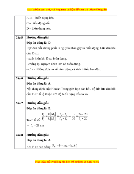 ạ nguyên nhân làm nó bi n d ế ng. ạ C. có xu hư ng đ ớ a ư nó v hì ề nh d ng và kí ạ ch thư c ớ ban đ u. ầ D. là l c ự gây bi n d ế ng cho ạ lò xo. Câu 6: Ch n đáp ọ án đúng. N i ộ dung đ nh l ị u t ậ Hooke? A. Trong gi i ớ h n ạ đàn h i ồ , độ l n ớ l c ự đàn h i ồ c a ủ lò xo t ỉl ệ thu n ậ v i ớ đ ộ bi n ế d ng ạ c a l ủ ò xo. B. Trong gi i ớ h n ạ đàn h i ồ , đ ộ l n ớ l c ự đàn h i ồ c a ủ lò xo t ỉl ệ ngh ch ị v i ớ đ ộ bi n ế d ng ạ c a l ủ ò xo. C. Khi độ bi n ế d ng ạ c a ủ v t ậ càng l n ớ thì l c ự đàn h i ồ cũng càng l n, ớ giá tr ịc a ủ l c