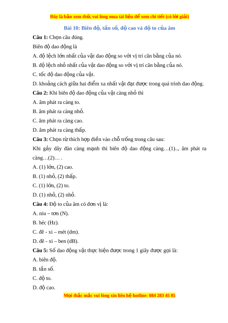 Đây là bản xem th , vu ử i lòng mua tài li u ệ đ xe ể m chi ti t ế (có l i ờ gi i ả ) Bài 10: Biên đ , t ộ n s ầ , đ ố ộ cao và đ t ộ o c a â ủ m Câu 1: Ch n ọ câu đúng. Biên độ dao đ ng l ộ à A. đ l ộ ch l ệ n nh ớ ất c a v ủ t ậ dao đ ng s ộ o v i ớ v t ị rí cân b ng ằ c a nó ủ . B. đ l ộ ch nh ệ ỏ nh t ấ c a ủ v t ậ dao đ ng ộ so v i ớ v t ị rí cân b ng c ằ a ủ nó. C. tốc đ dao đ ộ ng ộ c a v ủ t ậ . D. kho ng cách ả gi a hai ữ đi m ể xa nh t ấ v t ậ đ t ạ đư c t ợ rong quá trình dao đ ng ộ .
