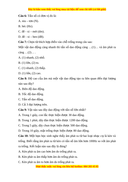Đây là bản xem th , vu ử i lòng mua tài li u ệ đ xe ể m chi ti t ế (có l i ờ gi i ả ) D. Kèn phát ra âm nh h ỏ n ơ âm do tr ng phát ố ra. L I Ờ GIẢI CHI TI T Ế Bài 10: Biên đ , t ộ n s ầ , đ ố ộ cao và đ t ộ o c a â ủ m Câu 1: Hư ng ớ d n gi ẫ i ả Đáp án đúng là: A Biên độ dao đ ng ộ là đ ộ l ch ệ l n ớ nh t ấ c a ủ v t ậ dao đ ng ộ so v i ớ v ịtrí cân b ng ằ c a nó. ủ Câu 2: Hư ng ớ d n gi ẫ i ả Đáp án đúng là: B Khi biên đ dao đ ộ ng ộ c a v ủ t ậ càng nh t