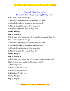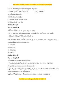 ế hiên enthapy trong các ph n ả ng hóa h ứ c ọ Câu 1. Ph n ả ng t ứ a nhi ỏ t ệ là gì? A. Là ph n ả ng gi ứ i ả phóng năng lư ng ợ dư i ớ d ng nhi ạ t ệ ; B. Là ph n ả ng h ứ p t ấ h năng l ụ ư ng d ợ ư i ớ d ng nhi ạ t ệ ; C. Là ph n ả ng gi ứ i ả phóng ion dư i ớ d ng nhi ạ t ệ ; D. Là ph n ả ng h ứ p t ấ hụ ion dư i ớ d ng nhi ạ t ệ . Hư ng d ớ ẫn gi i ả Đáp án đúng là: A Ph n ả ng t ứ a nhi ỏ t ệ là ph n ả ng ứ gi i ả phóng năng lư ng d ợ ư i ớ d ng nhi ạ t ệ . Câu 2. Ph n ả ng t ứ hu nhi t ệ là gì? A. Là ph n ả ng gi ứ i ả phóng năng lư ng ợ dư i ớ d ng nhi ạ t ệ ; B. Là ph n ả ng h ứ p t ấ h năng l ụ ư ng d ợ ư i ớ d ng nhi ạ t ệ ; C. Là ph n ả ng gi ứ i ả phóng ion dư i ớ d ng nhi ạ t ệ ; D. Là ph n ả ng h ứ p t ấ hụ ion dư i ớ d ng nhi ạ t ệ . Hư ng d ớ ẫn gi i ả Đáp án đúng là: B Ph n ả ng t ứ hu nhi t ệ là ph n ả ng h ứ p t ấ h năng l ụ ư ng d ợ ư i ớ d ng nhi ạ t ệ . Câu 3. Ph n ả ng nào s ứ au đây là ph n ả ng ứ thu nhi t ệ ? A. Ph n ả ng t ứ ôi vôi B. Ph n ả ng đ ứ t ố than và c i ủ ; C. Ph n ả ng phân h ứ y ủ đá vôi; D. Ph n ả ng đ ứ t ố nhiên li u. ệ Hư ng d ớ ẫn gi i ả Đáp án đúng là: C M i