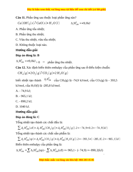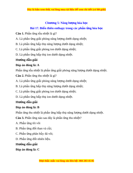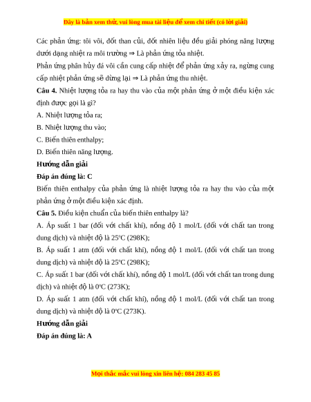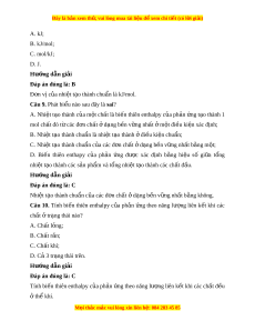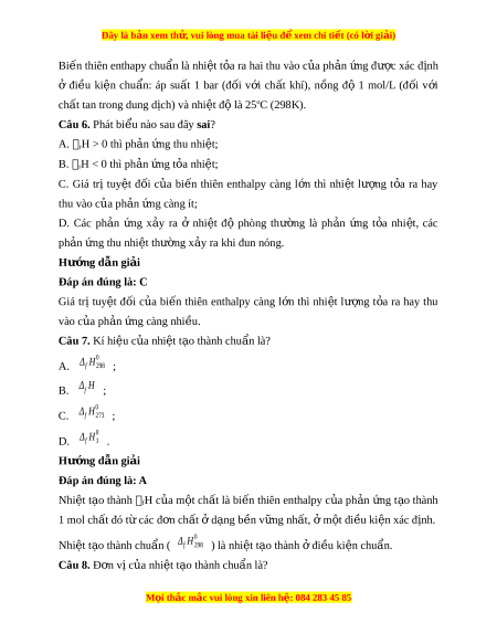 Đây là bản xem th , vu ử i lòng mua tài li u ệ đ xe ể m chi ti t (c ế ó l i ờ gi i ả ) Các ph n ả ng: ứ tôi vôi, đ t ố than c i ủ , đ t ố nhiên li u ệ đ u ề gi i ả phóng năng lư ng ợ dư i ớ d ng nhi ạ t ệ ra môi trư ng ờ ⇒ Là ph n ả ng t ứ a nhi ỏ ệt. Ph n ả ng ứ phân h y ủ đá vôi c n ầ cung c p ấ nhi t ệ đ ể ph n ả ng ứ x y ả ra, ng ng ừ cung cấp nhiệt ph n ả ng ứ s d ẽ ng l ừ i ạ ⇒ Là ph n ả ng t ứ hu nhi t ệ . Câu 4. Nhi t ệ lư ng ợ t a ỏ ra hay thu vào c a ủ m t ộ ph n ả ng ứ ở m t ộ đi u ề ki n ệ xác định đư c ợ g i ọ là gì? A. Nhi t ệ lư ng t ợ a ỏ ra; B. Nhi t ệ lư ng ợ thu vào; C. Bi n t ế hiên enthalpy; D. Bi n ế thiên năng lư ng. ợ Hư ng d ớ ẫn gi i ả Đáp án đúng là: C Bi n ế thiên enthalpy c a ủ ph n ả ng ứ là nhi t ệ lư ng ợ t a ỏ ra hay thu vào c a ủ m t ộ ph n ả ng ứ m ở t ộ đi u ki ề n xác đ ệ nh. ị Câu 5. Đi u ki ề n chu ệ n c ẩ a ủ bi n t ế hiên enthalpy là? A. Áp su t ấ 1 bar (đ i ố v i ớ ch t ấ khí), n ng ồ độ 1 mol/L (đ i ố v i ớ ch t ấ tan trong dung dịch) và nhi t ệ đ l ộ à 25oC (298K); B. Áp su t ấ 1 atm (đ i ố v i ớ ch t ấ khí), n ng ồ độ 1 mol/L (đ i ố v i ớ ch t ấ tan trong dung dịch) và nhi t ệ đ l ộ à 25oC (298K); C. Áp su t ấ 1 bar (đ i ố v i ớ ch t ấ khí), n ng đ ồ 1 m ộ ol/L (đ i ố v i ớ ch t ấ tan trong dung dịch) và nhiệt đ l ộ à 0oC (273K); D. Áp su t ấ 1 atm (đ i ố v i ớ ch t ấ khí), n ng ồ độ 1 mol/L (đ i ố v i ớ ch t ấ tan trong dung dịch) và nhi t ệ đ l ộ à 0oC (273K). Hư ng d ớ ẫn gi i ả Đáp án đúng là: A M i