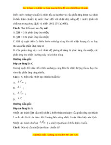 Câu 6. Phát bi u nào s ể au đây sai? A. ⧍rH > 0 thì ph n ả ng t ứ hu nhi t ệ ; B. ⧍rH < 0 thì ph n ả ng t ứ a ỏ nhi t ệ ; C. Giá trị tuy t ệ đ i ố c a ủ bi n ế thiên enthalpy càng l n ớ thì nhi t ệ lư ng ợ t a ỏ ra hay thu vào c a ủ ph n ả ng ứ càng ít; D. Các ph n ả ng ứ x y ả ra ở nhi t ệ độ phòng thư ng ờ là ph n ả ng ứ t a ỏ nhi t ệ , các ph n ả ng t ứ hu nhi t ệ thư ng ờ x y r ả a khi đun nóng. Hư ng d ớ ẫn gi i ả Đáp án đúng là: C Giá trị tuy t ệ đ i ố c a ủ bi n ế thiên enthalpy càng l n ớ thì nhi t ệ lư ng ợ t a ỏ ra hay thu vào c a ủ ph n ả ng ứ càng nhi u. ề Câu 7. Kí hi u c ệ a ủ nhi t ệ t o ạ thành chu n l ẩ à? 0 A. Δf H298 ; B. Δ H f ; 0 C. Δ H f 273 ; 0 D. Δf H1 . Hư ng d ớ ẫn gi i ả Đáp án đúng là: A Nhi t ệ t o ạ thành ⧍fH c a ủ m t ộ ch t ấ là bi n ế thiên enthalpy c a ủ ph n ả ng ứ t o ạ thành 1 mol ch t ấ đó t các ừ đ n ch ơ t ấ d ở ng b ạ n ề v ng nh ữ t ấ , m ở t ộ đi u ki ề n xác đ ệ nh. ị 0 Nhi t ệ t o t ạ hành chu n ( ẩ