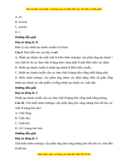 Đây là bản xem th , vu ử i lòng mua tài li u ệ đ xe ể m chi ti t (c ế ó l i ờ gi i ả ) A. kJ; B. kJ/mol; C. mol/kJ; D. J. Hư ng d ớ ẫn gi i ả Đáp án đúng là: B Đ n ơ v c ị a ủ nhi t ệ t o t ạ hành chu n l ẩ à kJ/mol.