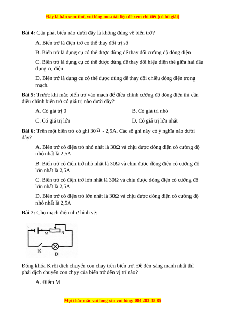 Bài 4: Câu phát biểu nào dưới đây là không đúng về biến trở?