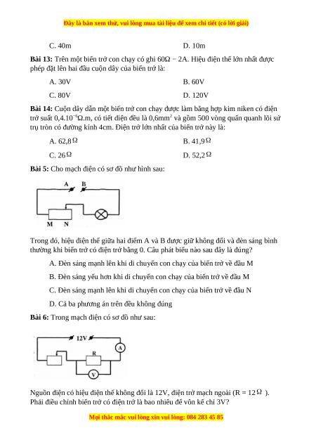Bài 11: Một biến trở con chạy có điện trở lớn nhất là 20 . Dây điện trở của biến
