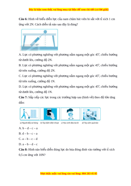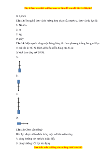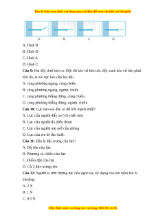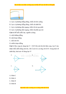 Đây là bản xem th , vu ử i lòng mua tài li u ệ đ xe ể m chi ti t ế (có l i ờ gi i ả ) A. Hình B B. Hình D C. Hình A D. Hình C Câu 9: Hai đ i ộ ch i ơ kéo co. Đ i ộ đ kéo v ỏ bên t ề rái, đ i ộ xanh kéo v bên ph ề i ả . Khi đó, ta nói l c kéo c ự a ủ hai đ i ộ A. cùng phư ng ngang, ơ cùng chi u ề B. cùng phư ng ơ ngang, ngư c ợ chi u ề C. cùng phư ng ơ th ng đ ẳ ng, cùng ứ chi u ề D. cùng phư ng t ơ h ng ẳ đ ng, ng ứ ư c ợ chi u ề Câu 10: L c nào s ự au đây có độ l n m ớ nh nh ạ t ấ ? A. L c ự c a ng ủ ư i ờ đ y xe ô t ẩ ô ch t ế máy B. L c c ự a ủ ngư i ờ n đi ấ n t ệ ho i ạ C. L c c ự a ủ ngư i ờ m m ẹ c ở a phòng ử D. L c ự c a em ủ bé đeo balô. Câu 11: Đâu là đ c ặ tr ng c ư a ủ l c? ự A. Đ l ộ n c ớ a ủ l c ự B. Phư ng ơ và chi u c ề a l ủ c ự C. Đi m ể đ t ặ c a l ủ c ự D. Cả 3 đ c t ặ r ng t ư rên Câu 12: Ngư i ờ ta ư c l ớ ư ng ợ l c c ự a ngón t ủ ay tác d ng vào nút ụ b m ấ bút bi kho ng: ả A. 2 N B. 1 N C. 0,5 N M i