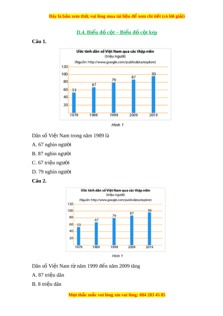 Đây là bản xem th , vu ử i lòng mua tài li u ệ đ xe ể m chi ti t ế (có l i ờ gi i ả ) D .4. B i u đ ể c ồ t ộ – Bi u ể đ c ồ t ộ kép Câu 1. Dân số Vi t ệ Nam trong năm 1989 là A. 67 nghìn ngư i ờ B. 87 nghìn ngư i ờ C. 67 tri u ng ệ ư i ờ D. 79 nghìn ngư i ờ Câu 2. Dân số Vi t ệ Nam t năm ừ 1999 đ n ế năm 2009 tăng A. 87 tri u dân ệ B. 8 tri u dân ệ M i