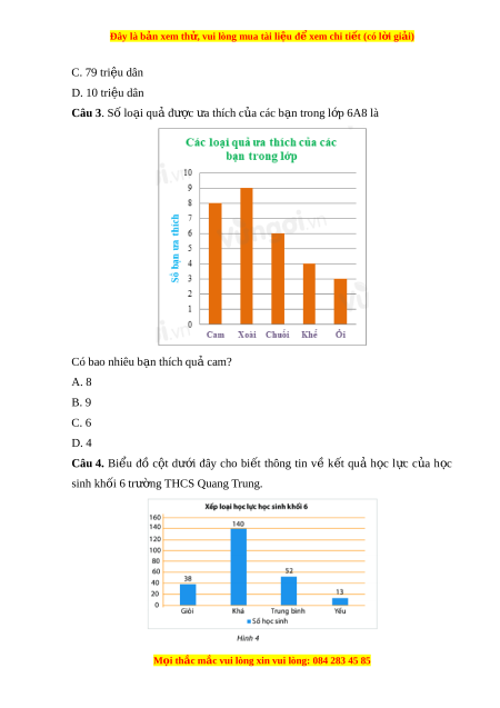 Đây là bản xem th , vu ử i lòng mua tài li u ệ đ xe ể m chi ti t ế (có l i ờ gi i ả ) C. 79 tri u dân ệ D. 10 tri u dân ệ Câu 3. Số lo i ạ qu đ ả ư c ợ a t ư hích c a ủ các b n ạ trong l p 6A ớ 8 là Có bao nhiêu b n ạ thích qu cam ả ? A. 8 B. 9 C. 6 D. 4 Câu 4. Bi u ể đồ c t ộ dư i ớ đây cho bi t ế thông tin về k t ế quả h c ọ l c ự c a ủ h c ọ sinh khối 6 trư ng ờ THCS Quang Trung. M i