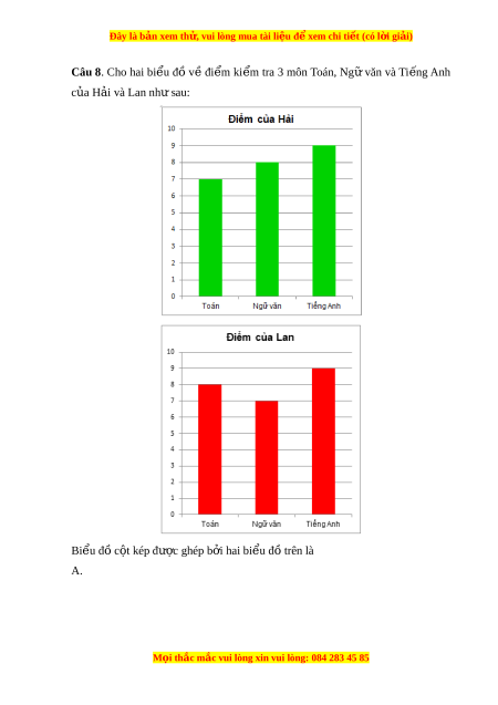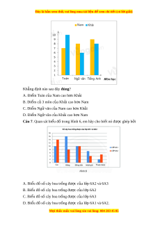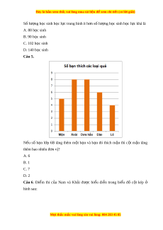 Đây là bản xem th , vu ử i lòng mua tài li u ệ đ xe ể m chi ti t ế (có l i ờ gi i ả ) Số lư ng ợ h c s ọ inh h c ọ l c t ự rung bình ít h n ơ s l ố ư ng h ợ c ọ sinh h c l ọ c ự khá là A. 88 h c s ọ inh B. 90 h c ọ sinh C. 102 h c ọ sinh D. 140 h c s ọ inh Câu 5. N u ế số b n ạ l p ớ 6B tăng thêm m t ộ b n ạ và b n ạ đó thích m n ậ thì c t ộ m n ậ tăng thêm bao nhiêu đ n v ơ ? ị A. 6 B. 1 C. 7 D. 2 Câu 6. Đi m ể thi c a ủ Nam và Kh i ả đư c ợ bi u ể di n ễ trong bi u ể đồ c t ộ kép ở hình sau: M i