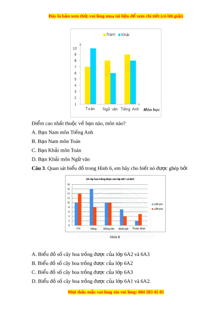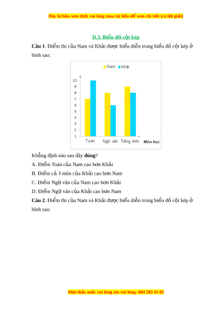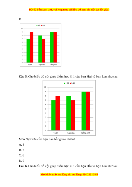 Đây là bản xem th , vu ử i lòng mua tài li u ệ đ xe ể m chi ti t ế (có l i ờ gi i ả ) Câu 4. Cho hai bi u đ ể ồ v đi ề m ể ki m ể tra 3 môn Toán, Ng văn ữ và Ti ng ế Anh c a H ủ i ả và Lan nh s ư au: Bi u đ ể ồ c t ộ kép được ghép b i ở hai bi u ể đồ trên là A. M i