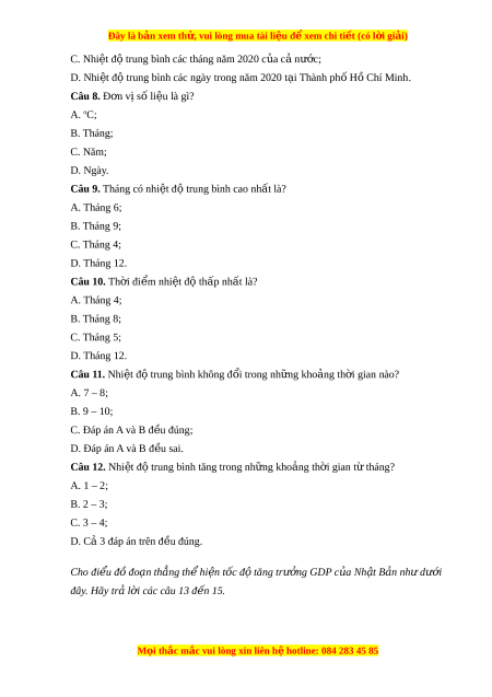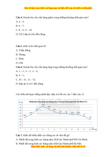 ể nhiệt độ thấp nhất là? A. Tháng 4; B. Tháng 8; C. Tháng 5; D. Tháng 12. Câu 11. Nhi t ệ đ ộ trung bình không đ i ổ trong nh ng ữ kho ng ả th i ờ gian nào? A. 7 – 8; B. 9 – 10; C. Đáp án A và B đ u ề đúng; D. Đáp án A và B đ u ề sai. Câu 12. Nhi t