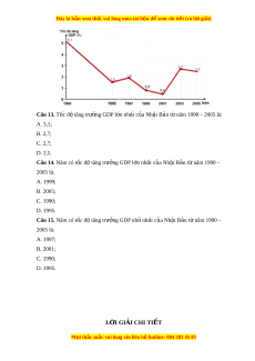Đây là bản xem th , vu ử i lòng mua tài li u ệ đ xe ể m chi ti t ế (có l i ờ gi i ả ) Câu 13. Tốc đ ộ tăng trư ng ở GDP l n ớ nh t ấ c a ủ Nh t ậ B n ả t ừ năm 1990 – 2005 là: A. 5,1; B. 2,7; C. 2,7; D. 2,5. Câu 14. Năm có t c ố đ ộ tăng trư ng ở GDP l n ớ nh t ấ c a ủ Nh t ậ B n ả t ừ năm 1990 – 2005 là: A. 1999; B. 2005; C. 1990; D. 1995. Câu 15. Năm có t c ố đ ộ tăng trư ng ở GDP nh ỏ nh t ấ c a ủ Nh t ậ B n ả t ừ năm 1990 – 2005 là: A. 1997; B. 2001; C. 1990; D. 1995. L I Ờ GIẢI CHI TI T Ế M i ọ thắc m c